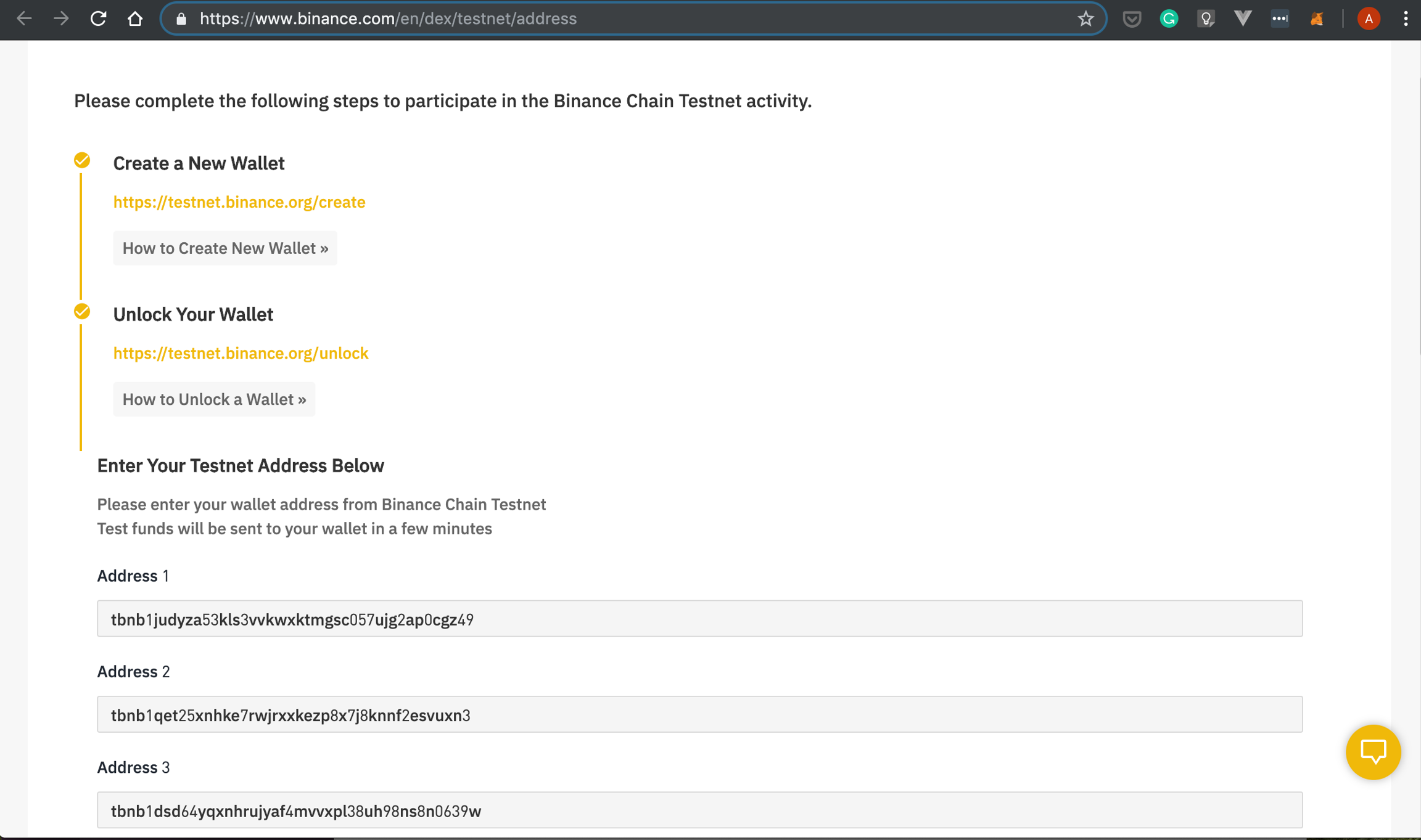 At this point, you are ready to get yourself some BNB TestNet tokens. Go to the Binance TestNet Faucet and paste your addresses:
