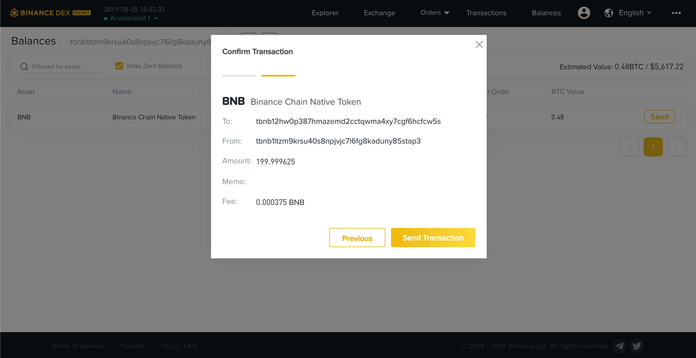 Of course, your initial BEP2 and BNB balances will be 0. Go to Binance, and transfer some BEP2 and BNP to zeknd TestNet. To do so, set the To Address to tbnb1gc7azhlup5a34t8us84x6d0fluw57deuf47q9w (that is the hot wallet address) and don't forget to put your zeknd address in the memo field.