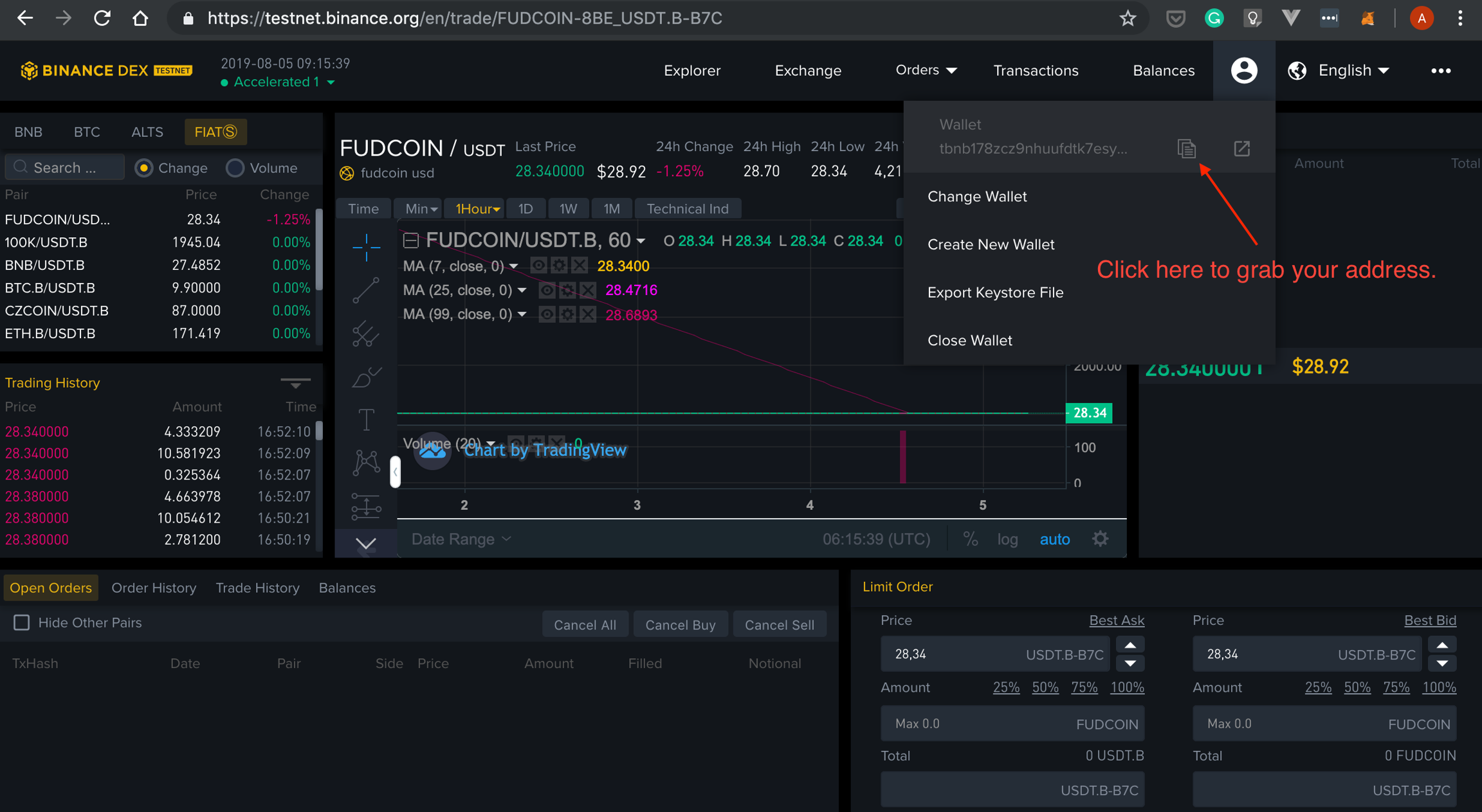 keystore_a,keystore_b, andkeystore_c. Alsdo, don't forget to save the mnemonics somewhere safe.Head over to the Unlock Page and unlock wallet A. This will take you the Binance DEX main page. Select your account from the top menu bar and copy your address. Next, paste it to a new document.