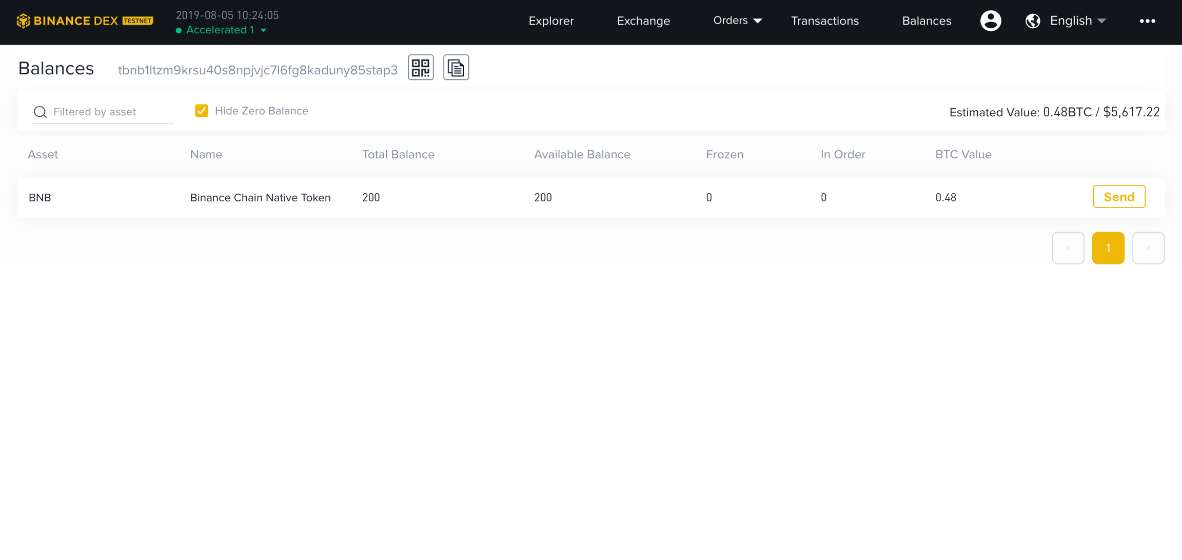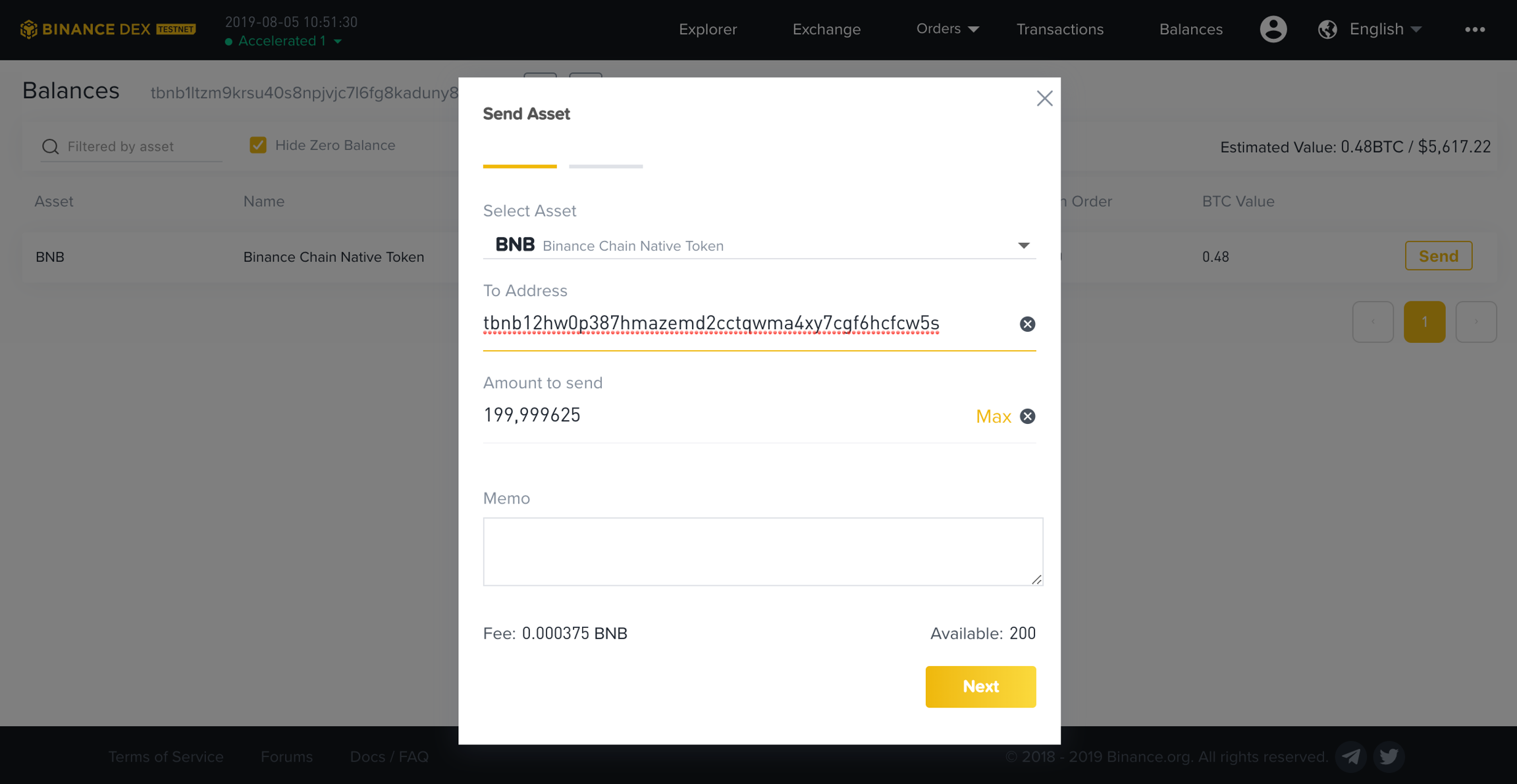Submit button. This will credit each wallet with 200 TestNet BNB tokens.Now, what's left to do is to transfer the BNB TestNet tokens from wallet B and C to wallet A. Let's unlock wallet B by uploading the keystore file and typing the password. This will redirect you to the Binance TestNet home page. From the top menu bar select